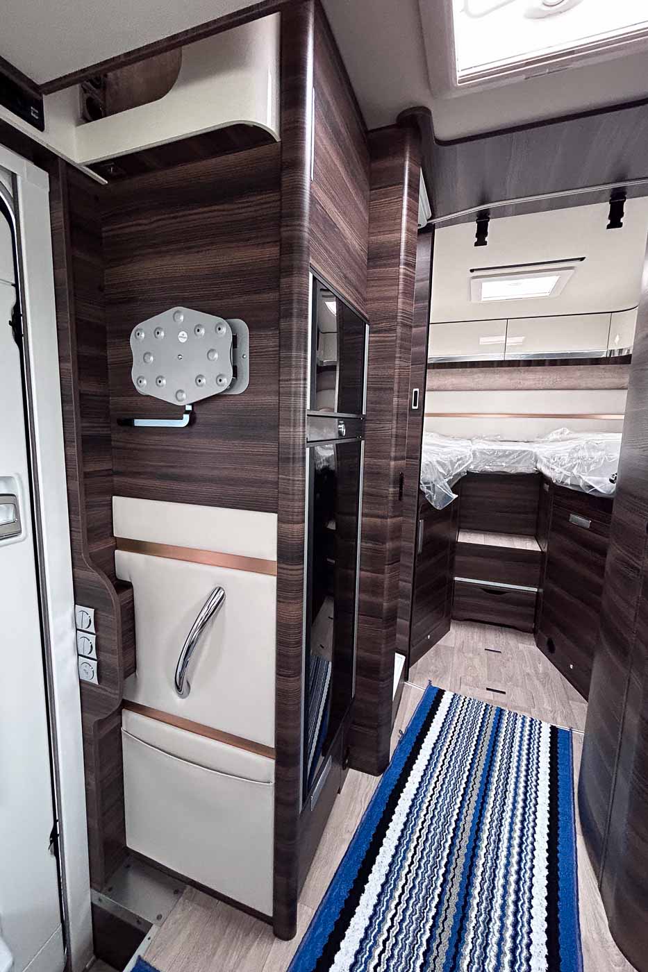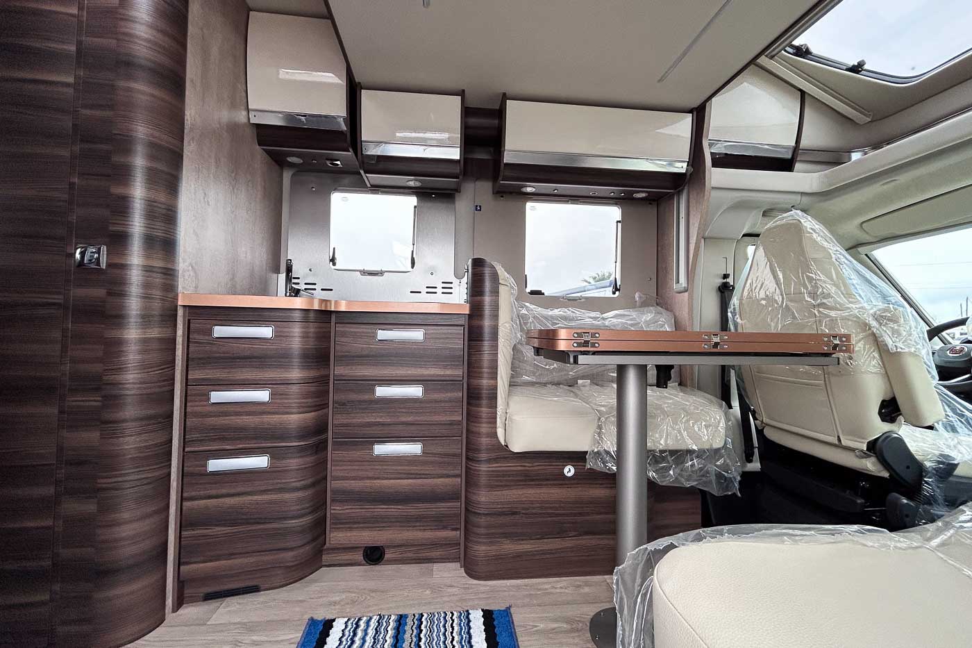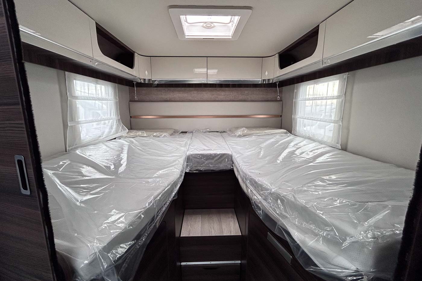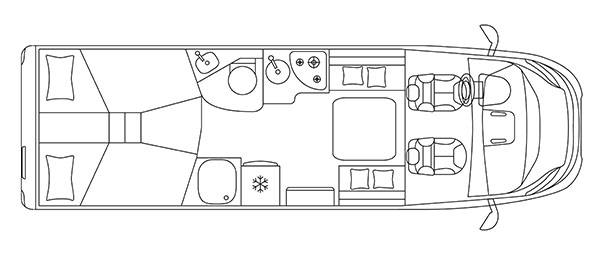 Su distribución interior se caracteriza principalmente por disponer de camas gemelas en la parte trasera, permitiendo disfrutar de dos camas individuales de fácil acceso, transformable en un único espacio para el descanso de grandes dimensiones. Cuenta con numerosos espacios de almacenamiento, tanto en la parte superior como en la parte inferior de la cama.