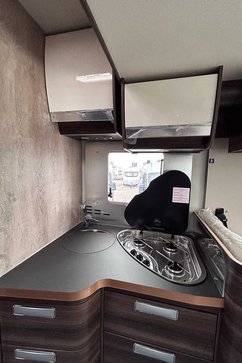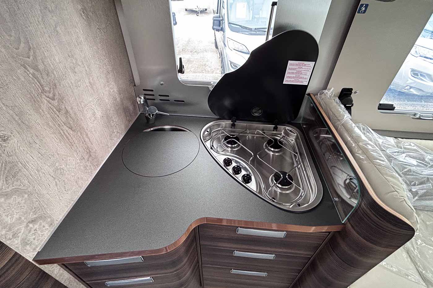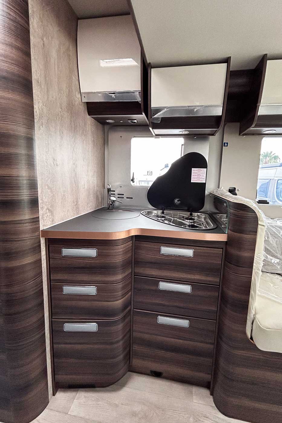 La cocina la encontramos en la parte central del vehículo y está completamente equipada: cuenta con tres fuegos, fregadero y frigorífico grande.