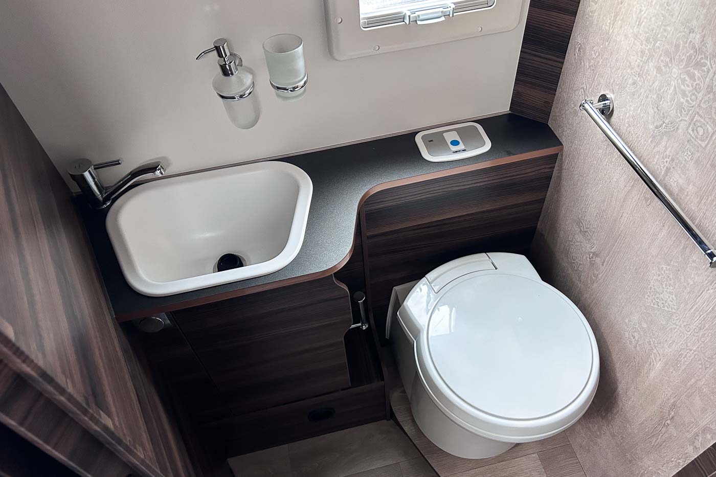 Dispone de baño equipado con todo lo necesario: W.C., lavamanos y espacios de almacenamiento para nuestro equipaje de baño. Cuenta con cabina de ducha independiente.
