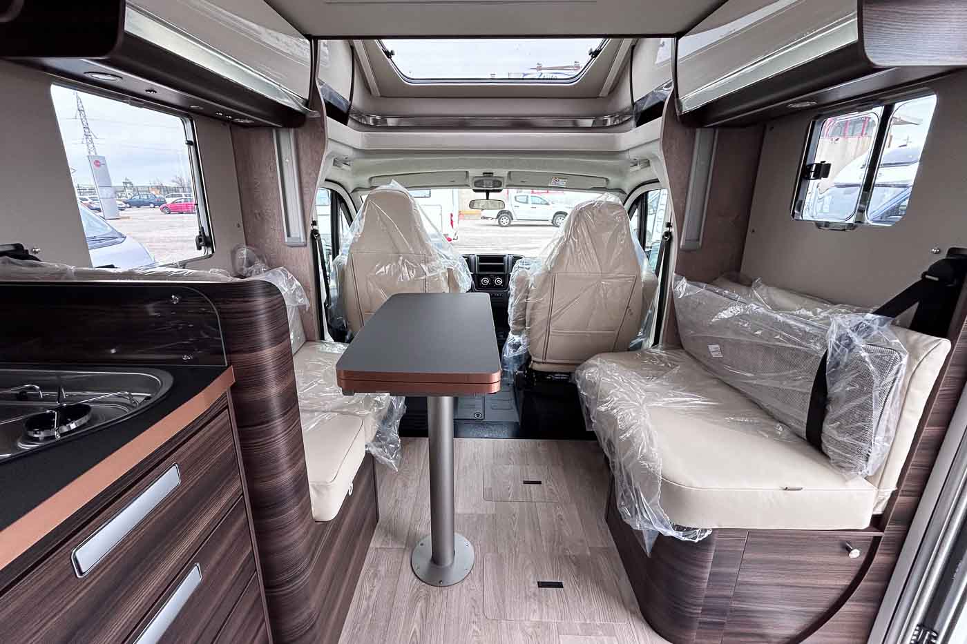 Cuenta con cómodo salón en «face to face» con gran mesa central plegable; un espacio cómodo gracias a los asientos giratorios de la cabina y los asientos enfrentados de los que dispone. Sobre esta zona se encuentra además una segunda cama doble, fácilmente abatible desde el techo.